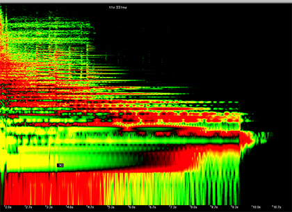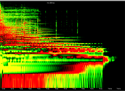 Dafür benutzen wir die sog. Audio-Retouch-Tools: In der Darstellung links sieht man 10 Sekunden eines Musikstückes (x-Achse), die Frequenz ist auf der y-Achse abzulesen. Zusätzlich gibt die Farbabstufung von rot über grün bis gelb Auskunft über die Intensität des Schallereignisses. Dies hat den Vorteil, Störungen wesentlich besser als in der Amplitudendarstellung erkennen und lokalisieren zu können.